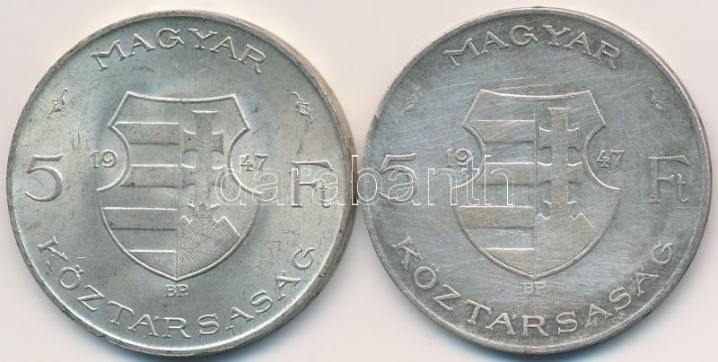 1947. 5Ft Ag "Kossuth" (2x) T:2-,3 https://www.darabanth.com/hu/257-Gyorsarveres/257.0/Numizmatika/Magyar-es-magyar-verdejelu-fem-es-ezustpenzek~200008/1947-5Ft-Ag-Kossuth-2x-T2-3~II1259446