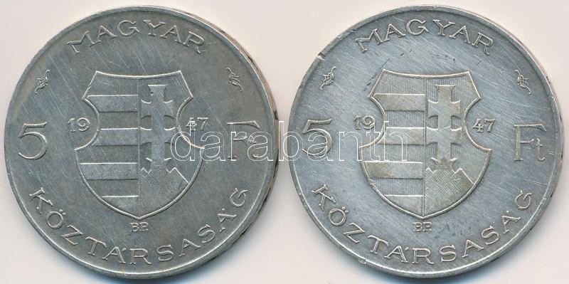 1947. 5Ft Ag "Kossuth" (2x) T:2-,3 https://www.darabanth.com/hu/257-Gyorsarveres/257.0/Numizmatika/Magyar-es-magyar-verdejelu-fem-es-ezustpenzek~200008/1947-5Ft-Ag-Kossuth-2x-T2-3~II1259451