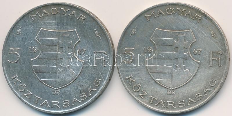 1947. 5Ft Ag "Kossuth" (2x) T:2-,3 https://www.darabanth.com/hu/257-Gyorsarveres/257.0/Numizmatika/Magyar-es-magyar-verdejelu-fem-es-ezustpenzek~200008/1947-5Ft-Ag-Kossuth-2x-T2-3~II1259463