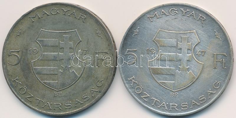 1947. 5Ft Ag "Kossuth" (2x) T:2-,3 https://www.darabanth.com/hu/257-Gyorsarveres/257.0/Numizmatika/Magyar-es-magyar-verdejelu-fem-es-ezustpenzek~200008/1947-5Ft-Ag-Kossuth-2x-T2-3~II1259477