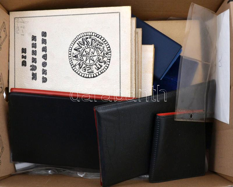 Leírás: Nagy kellék tétel: berakólapok, dísztokok, albumok, érmetartó zacskók, víztiszta bankjegytokok használt állapotban
