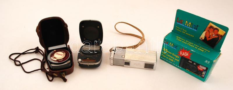 Kiev Vega Super 8-as automata fényképezőgép 2 db fényszűrővel, működőképes állapotban, egyszer használatos 27 exp fényképezőgép eredeti, bontatlan csomagolásában, 2 db használt fénymérő