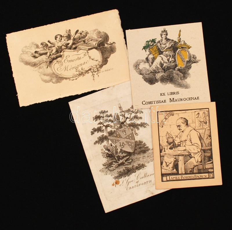 Vegyes ex libris tétel, fa, réz és litho, 4db ebből 3db dúcon jelzett: E. De Malval, Marks, Khicusoads, 1db jelzés nélkül. Különböző méretben és minőségben, 8x6cm és 12x8cm között