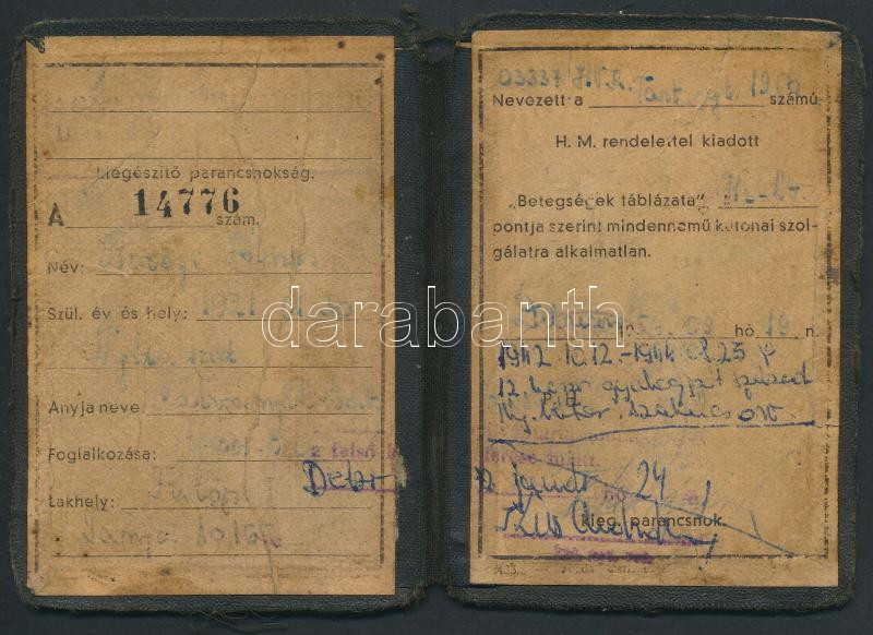 1942 Debrecen, Alkalmatlansági igazolás https://www.darabanth.com/hu/258-Gyorsarveres/258.0/Festmeny-mutargy-papirregiseg-egyeb/Militaria~24/1942-Debrecen-Alkalmatlansagi-igazolas~II1271036