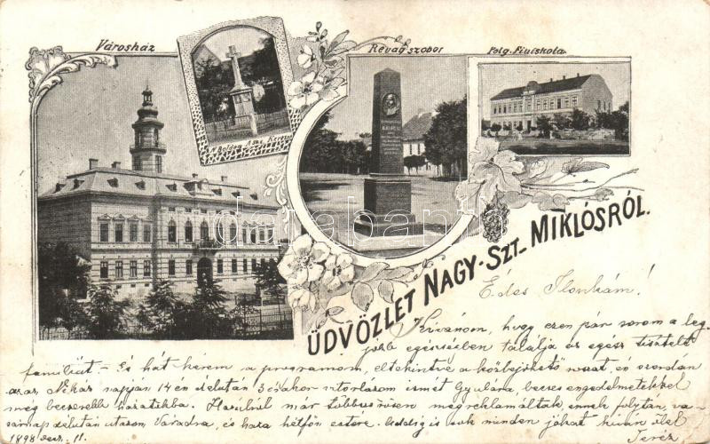 Leírás: 1898 Nagyszentmiklós, Sannicolau Mare; Városház, Révay szobor, Polgári fiúiskola / town hall, statue, boys school; Art Nouveau, floral (EB)