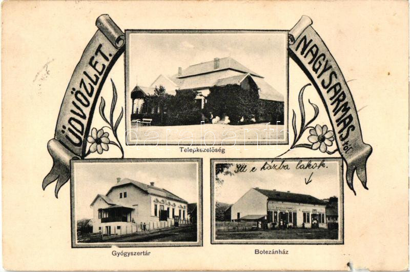 Leírás: Nagysármás, Sarmasu; Telepkezelőség, gyógyszertár, Botezán Pompej üzlete, kiadja Kabát Emil / plant operator, pharmacy, shop, floral (b)