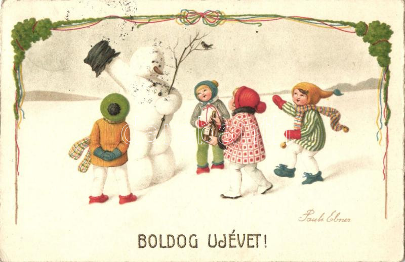 New Year, children, snowman, A.G.B. No. 3073. s: Pauli Ebner (EK) https://www.darabanth.com/hu/258-Gyorsarveres/258.0/Kepeslapok/Gyerek~200088/New-Year-children-snowman-AGB-No-3073-s-Pauli-Ebner-EK~II1248639