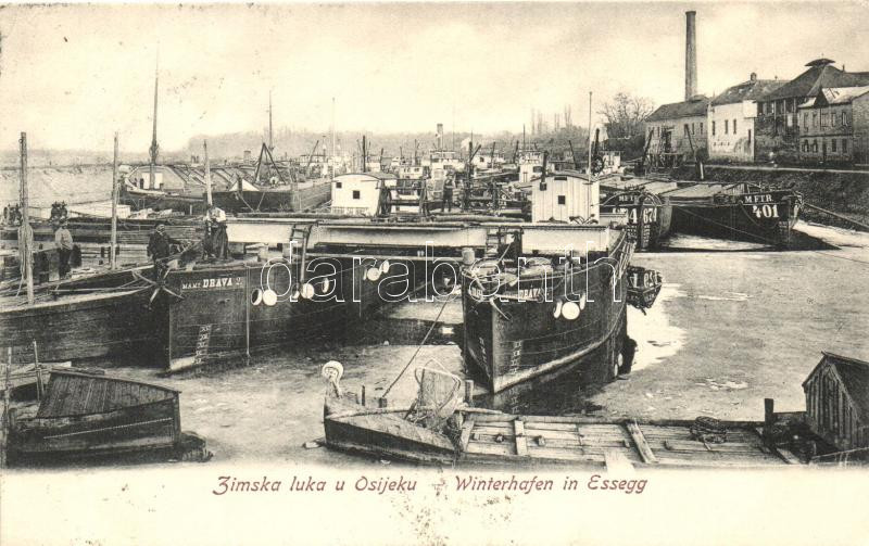 Eszék, Esseg, Osijek; téli kikötő, uszályok / winter harbor, barges https://www.darabanth.com/hu/258-Gyorsarveres/258.0/Kepeslapok/Horvatorszag-Delvidek~200031/Eszek-Esseg-Osijek-teli-kikoto-uszalyok-winter-harbor-barges~II1268928