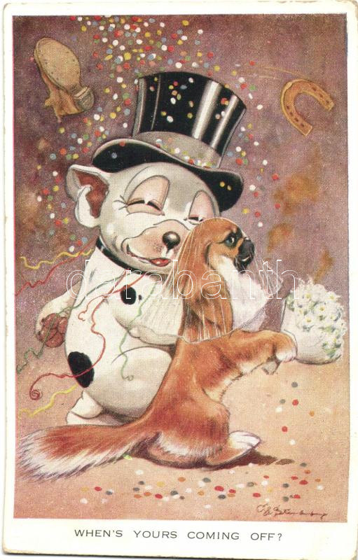 When's yours coming off? Bonzo dog, wedding, August Röckl 1670/2. s: G... https://www.darabanth.com/hu/258-Gyorsarveres/258.0/Kepeslapok/Kutya~200073/Whens-yours-coming-off-Bonzo-dog-wedding-August-Rockl-16702-s-G-E-Studdy~II1269588