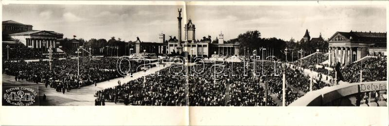 1938 Budapest XIV. Hősök tere, XXXIV. Nemzetközi Eucharisztikus kongresszus, mise; panoramacard, nem jó helyen összehajtva, kiadja Dely-foto (kis szakadás / small tear)