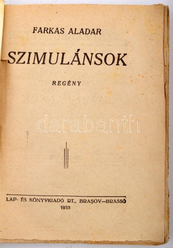 Leírás: Ponyvaregények, 2db: J Jefferson:Árnyak a tengeren. Bp., Pesti Hírlap könyvek. Farkas Aladár: Szimulánsok. Brassó, 1933. Lap és Könyvkiadó