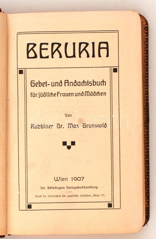 Rabbiner Max Grunwald: Beruria : Gebet- und Andachtsbuch für jüdische Frauen und Mädchen. Wien, 1907, Schlesinger. Kiadói aranyozott, kissé foltos egészvászon-kötésben, aranyozott lapszélekkel.