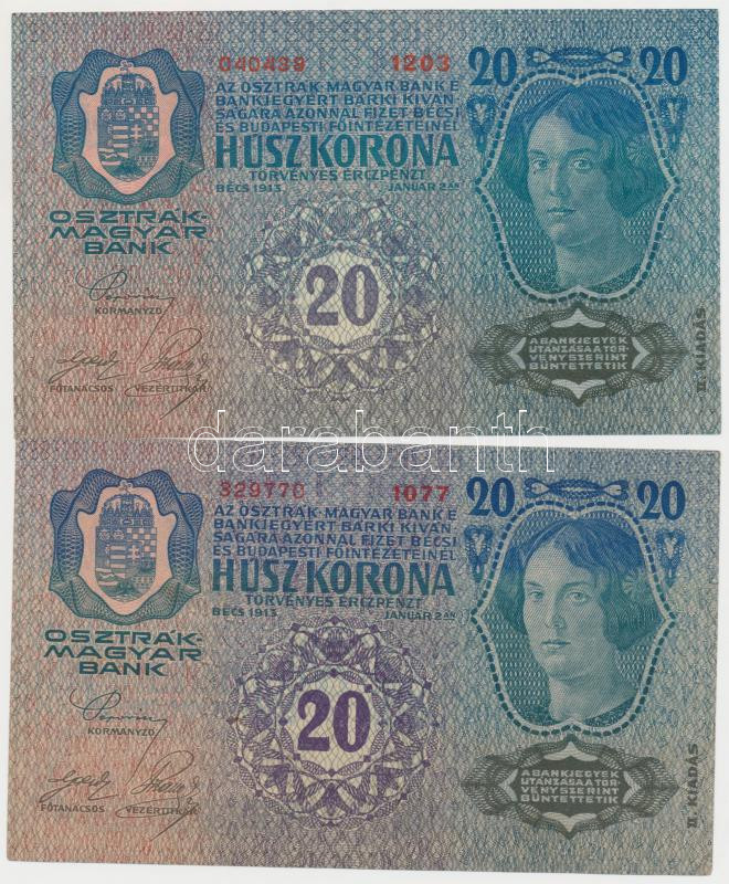 Leírás: 1913. 20K II. kiadás (2x) az egyik "Deutschösterreich", a másik hamis "Ausgegeben nach dem 4. oktober 1920" felülbélyegzéssel / fake overprint T:I-,II