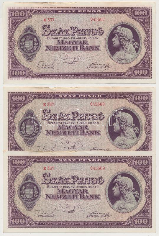 Leírás: 1945. 100P (3x) sorszámkövetők, "BÜNTETÉS" szóban "N" felett lemezhiba T:II-