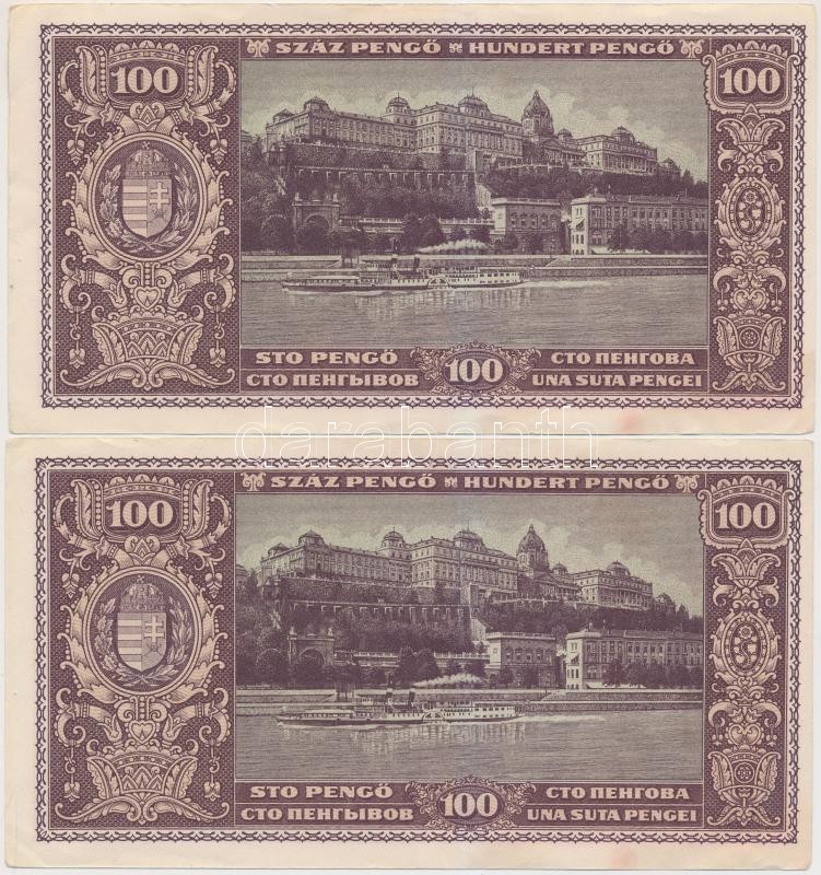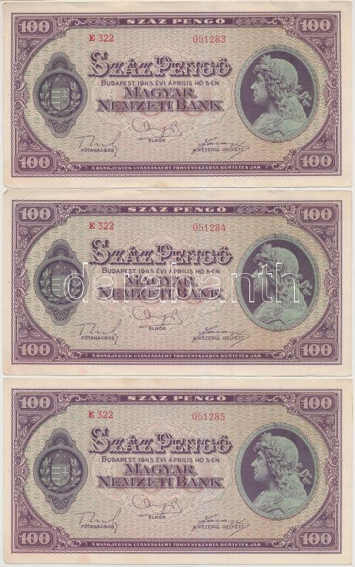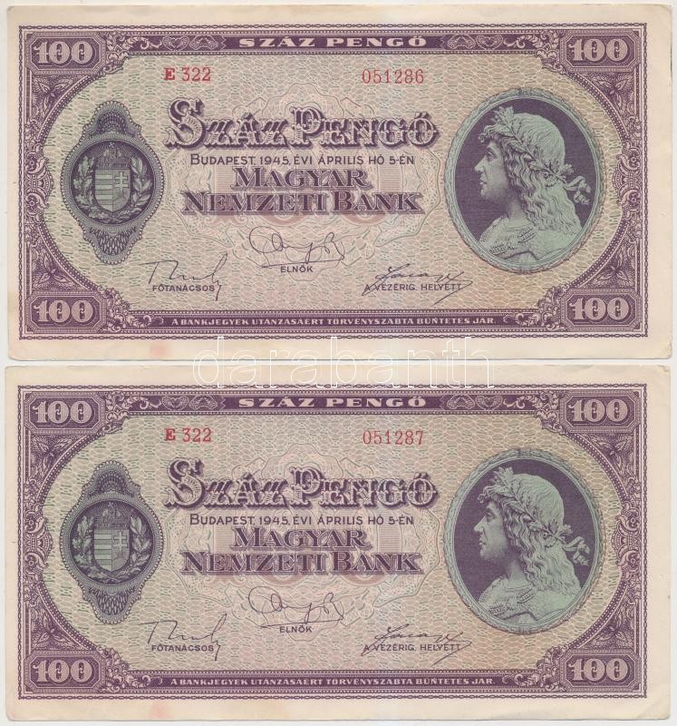 1945. 100P (5x) sorszámkövetők T:I-,II https://www.darabanth.com/hu/258-Gyorsarveres/258.0/Numizmatika/Magyar-bankjegyek~400007/1945-100P-5x-sorszamkovetok-TI-II~II1266478
