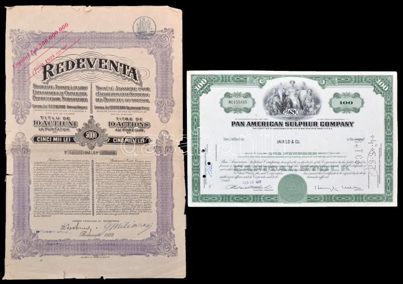 Amerikai Egyesült Államok / New York 1961. Pánamerikai Kén Részvénytársaság" részvényelismervény 100$-ról, lyukasztott, felülbélyegzett + Románia / Bukarest 1923. "Redeventa" részvény 5000L-ről, felülbélyegzésekkel és szelvényekkel T:II-,III-