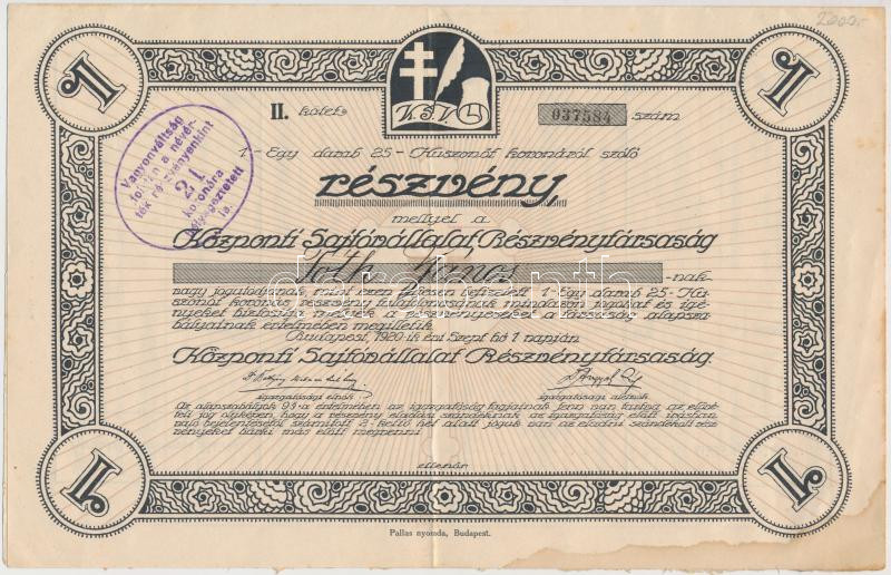 Budapest 1920. "Központi Sajtóvállalat Részvénytársaság" részvénye 25K... https://www.darabanth.com/hu/258-Gyorsarveres/258.0/Numizmatika/Reszvenyek-es-sorsjegyek~400005/Budapest-1920-Kozponti-Sajtovallalat-Reszvenytarsasag-reszvenye-25K-rol-szelvenyekkel~II1265235