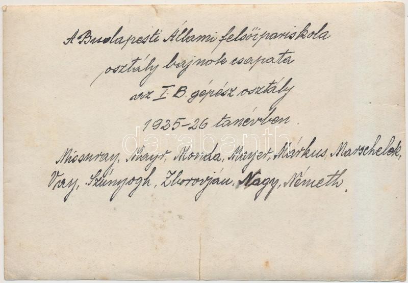 Leírás: 1925-26 A Budapesti Állami Felsőipariskola bajnok csapata fotó verzón feliratozva, teljes névsorral, 8x12cm