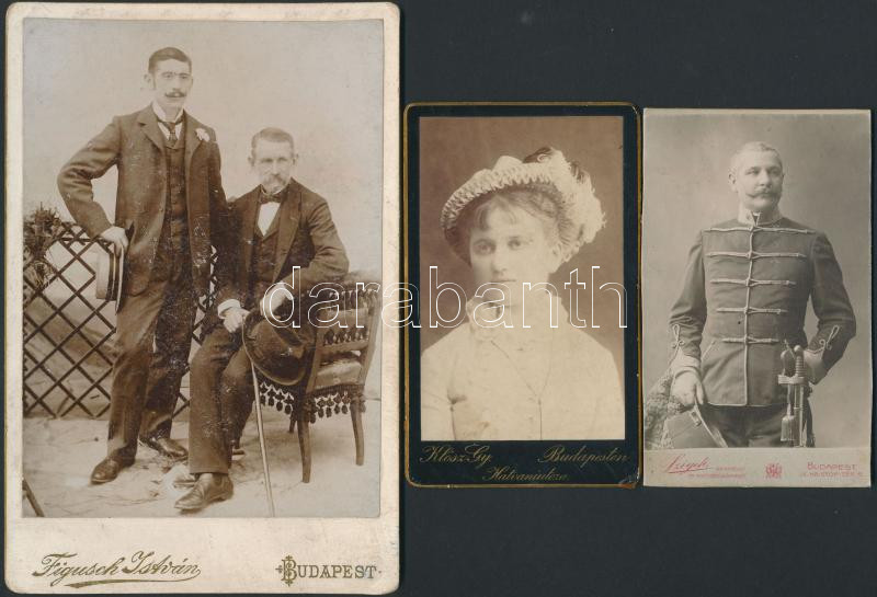 Leírás: cca 1890 3 db keményhátú fotó budapesti műtermekből Klösz Gy., Sziget és Figusch műtermeiből. többféle verzóval. 10,5x6 és 16x11 cm.