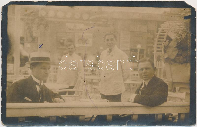 Leírás: cca 1920 Angolparki ozsonnázás. Jelzetlen, hátoldalon feliratozva. Egy sarok sérült. 14x9 cm.