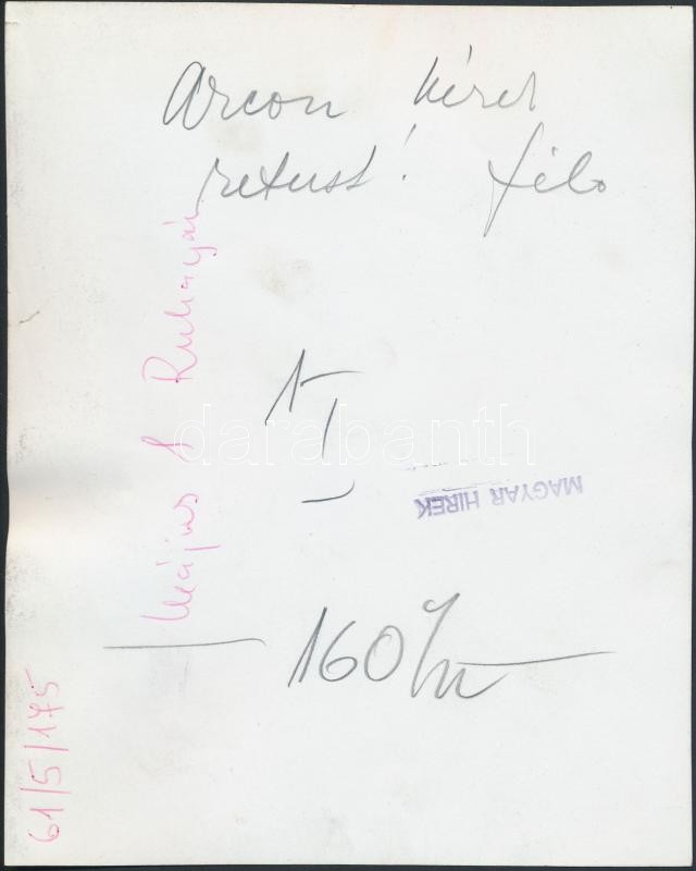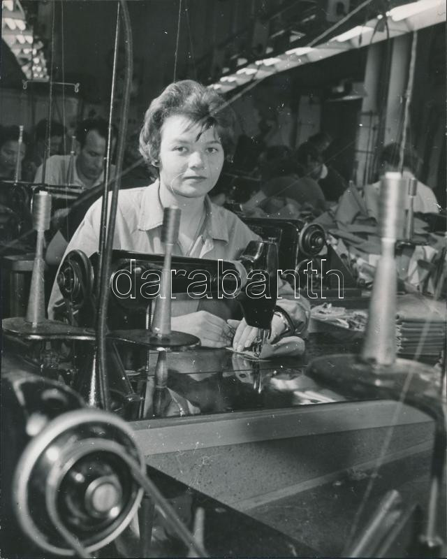 Leírás: cca 1961 A Május 1. Ruhagyár öntudatos munkása. Filó Éva sajátkezű jegyzetével: "Arcon kérek retust" Sajtófotó, hátoldalán pecséttel, feliratozva. 17x15 cm.