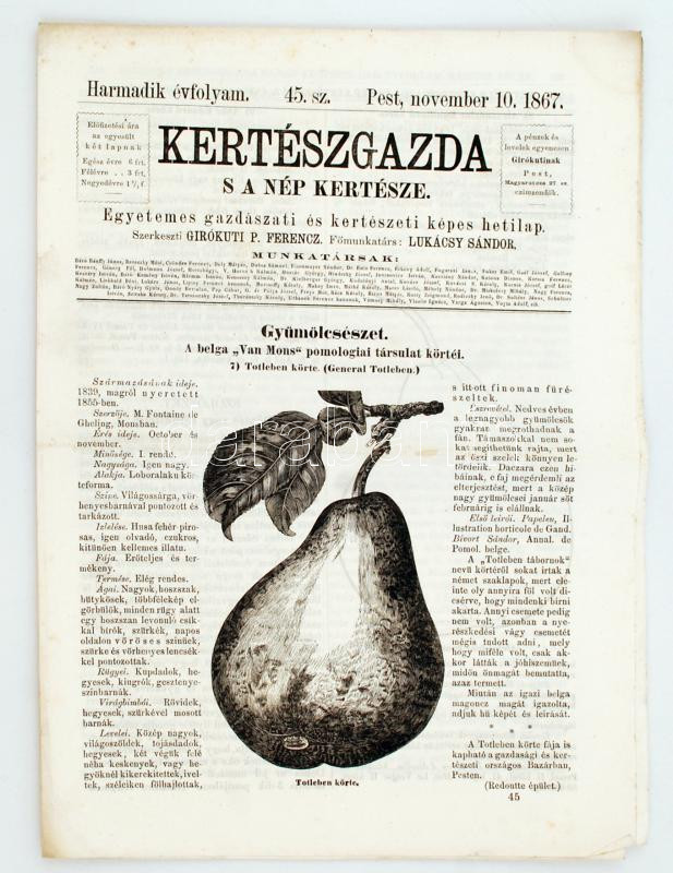 1867 Kertészgazda s a nép kertésze, egyetemes gazdászati és kertészeti képes hetilap. Szerk.: Girókuti P. Ferenc. 3. évf. 45. sz. Pest, Emich Gusztáv. Érdekes írásokkal, illusztrációkkal.