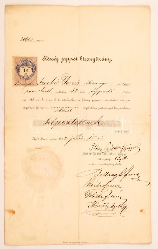 Leírás: 1892 Nyelvvizsga-bizonyítvány aláírásokkal, pecséttel, illetékbélyeggel. Kis szakadással a hajtás mentén. 34,5x21cm.