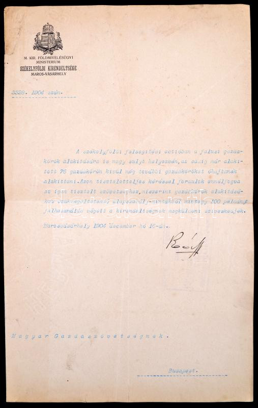 Leírás: 1904 A M. Kir. Földmivelésügyi Ministerium Székelyföldi Kirendeltsége, Maros- Vásárhelyi levele gazdakör alakítási ügyben, 34x21cm
