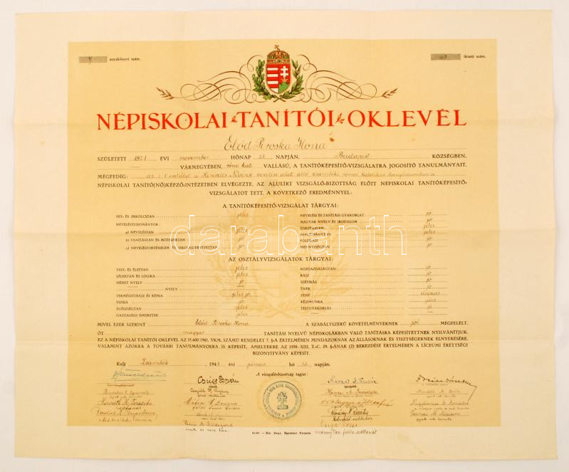 1921 Elemi népiskolai tanítói oklevél 50x32 cm https://www.darabanth.com/hu/259-Gyorsarveres/259.0/Festmeny-mutargy-papirregiseg-egyeb/Okmanyok~15/1921-Elemi-nepiskolai-tanitoi-oklevel-50x32-cm~II1278498
