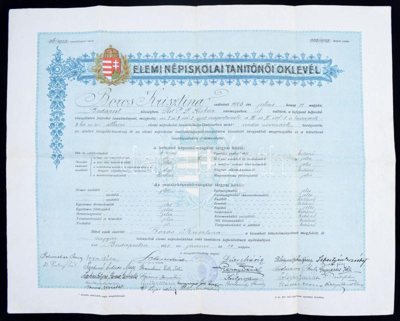 1923 Elemi népiskolai tanítónői oklevél, 39x48cm https://www.darabanth.com/hu/259-Gyorsarveres/259.0/Festmeny-mutargy-papirregiseg-egyeb/Okmanyok~15/1923-Elemi-nepiskolai-tanitonoi-oklevel-39x48cm~II1273764
