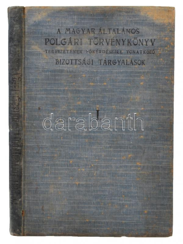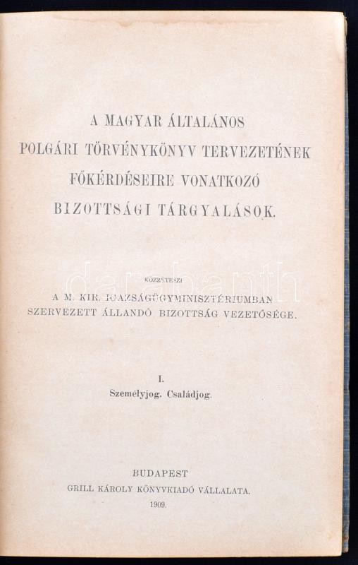 A Magyar általános polgári törvénykönyv tervezetének főkérdéseire vonatkozó bizottsági tárgyalások. I. Személyjog. Családjog. Budapest, 1909, Grill Károly. Foltos kiadói egészvászon kötésben.