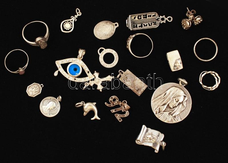 Vegyes ezüst tétel, benne medál, fülbevaló, és gyűrű, Ag, bruttó: 41,6gr., jelzettek, 20db/ Various silver items, including pendants, earrings, and rings, Ag, gross: 41,6gr, as indicated, 20 pcs.