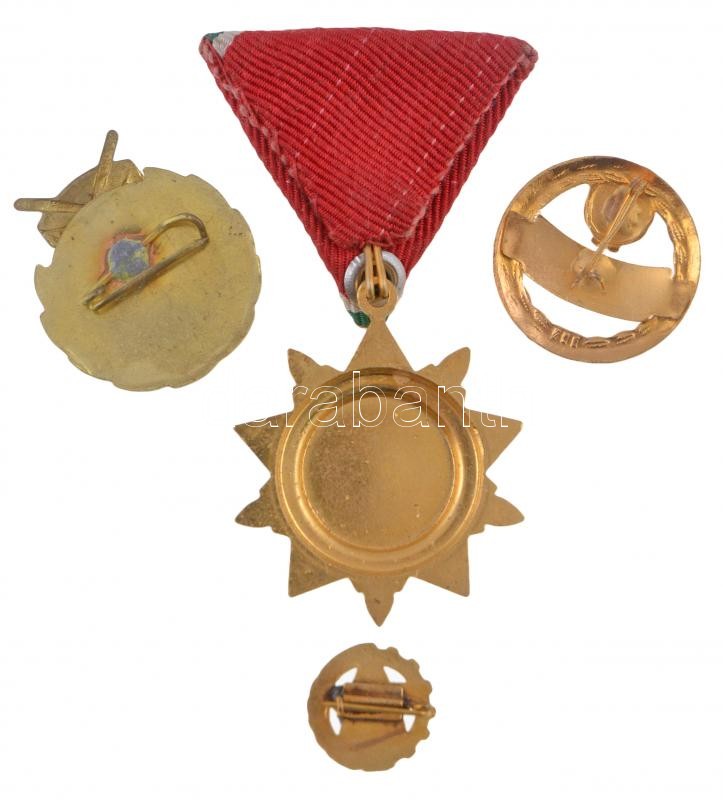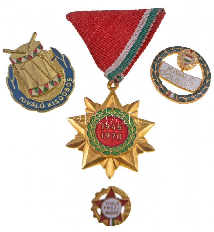 Leírás: 1970. "Felszabadulási Jubileumi Emlékérem" aranyozott, zománcozott Br kitüntetés mellszalagon + ~1970-1980. "Kiváló Dolgozó" aranyozott, zománcozott kitüntetés + "Kiváló FMSZ-i Dolgozó" kitüntetés aranyozott, zománcozott miniatűrje + "Kiváló kisdobos" festett fém jelvény T:2