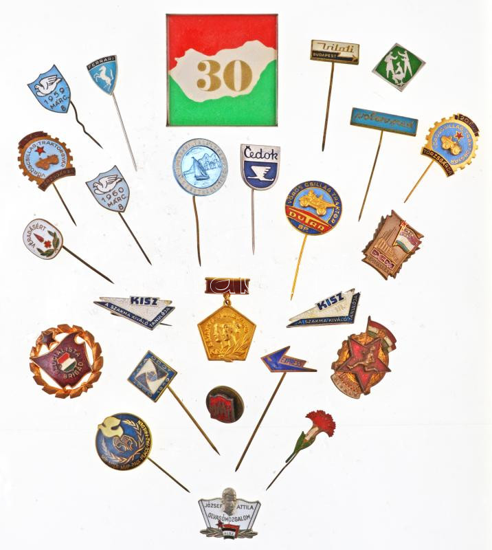 25db vegyes magyar és külföldi szocialista kitűző, jelvény, kitüntetés, közte "Május 1." festett fém kitűző, "Dutra Vöröscsillag Traktor" aranyozott, zománcozott fém kitűző T:2,2-