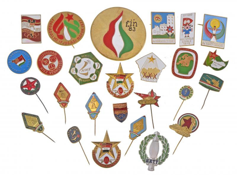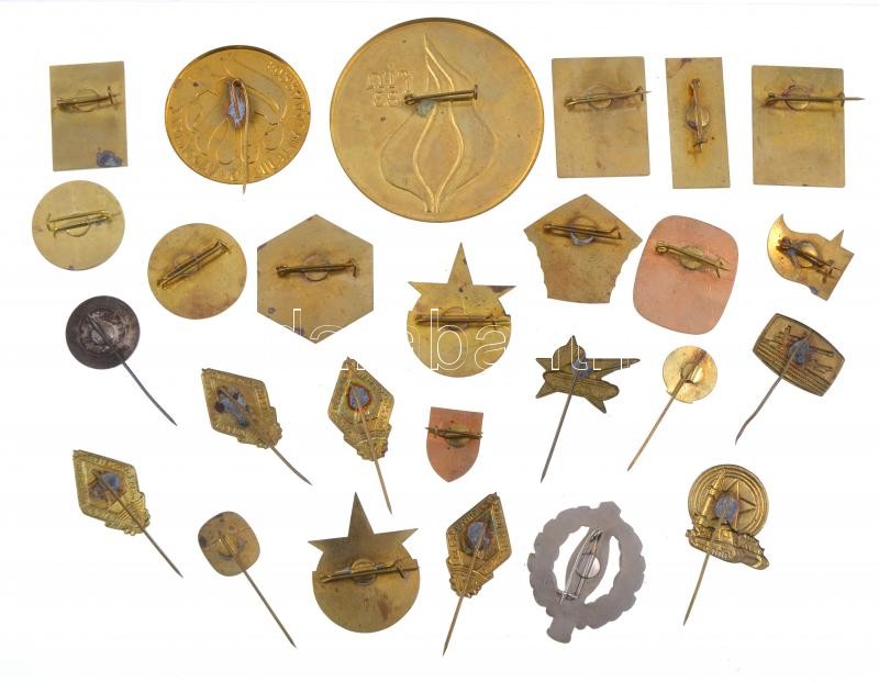 Leírás: 26db vegyes szocialista jelvény, kitűző, közte 1985. "Országos Ökölvívó Úttörő Olimpia Döntő - Dombóvár 1985.III.30-31." festett fém jelvény T:vegyes