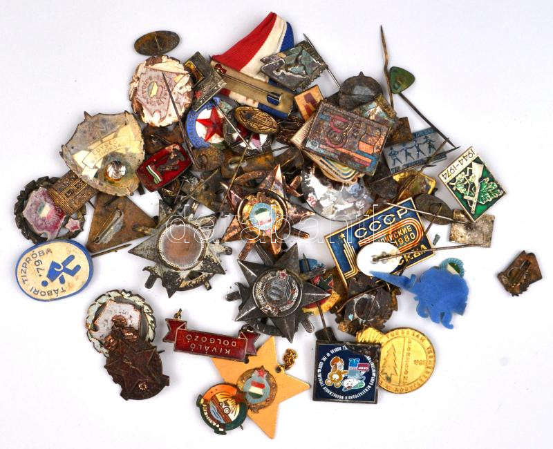 57db-os vegyes magyar és külföldi jelvény és kitűző a szocialista időszakból, közte "Moszkvai Olimpia", "Kilián", "Honvédelemért", "MEDOSZ" T:vegyes (közte több sérült)