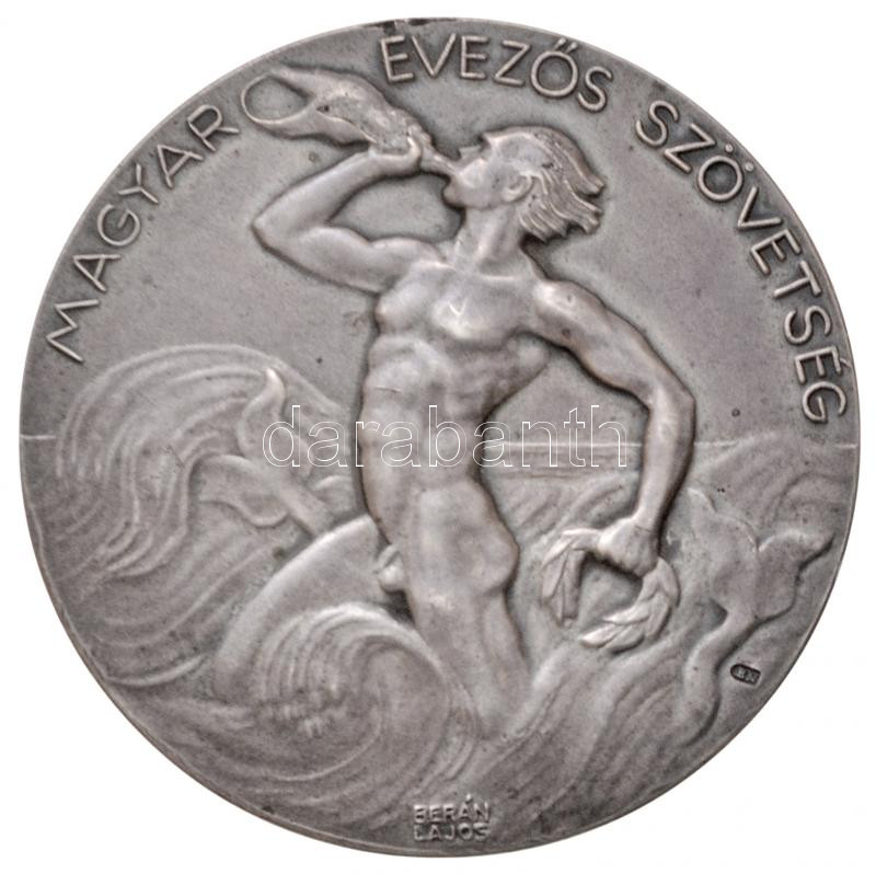 Berán Lajos (1882-1943) 1926. "Magyar Evezős Szövetség" jelzett Ag díjérem "BERÁN N BPEST" gyártói jelzéssel, hátoldalon "KORM. NÉLK. NÉGYES I. BPEST 1939. VI. 25." gravírozással (46,11g/50,5mm) T:2,2- ph., apró ü. Hungary 1926. "Hungarian Rowing Club" marked Ag award medal with makers mark "BERÁN N BPEST", and with engraving. Sign.: Lajos Berán (46,11g/50,5mm) C:XF,VF edge error, small ding HPII 218.