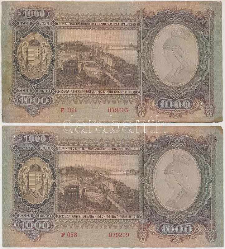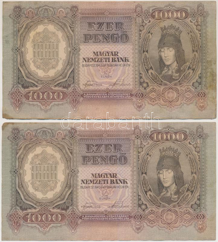 Leírás: 1943. 1000P (2x) közeli sorszámúak T:II folt, kis sarokhiány