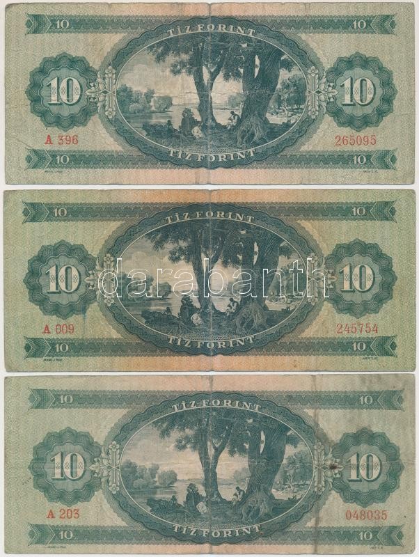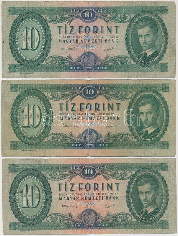 1949. 10Ft (3x) T:III,III- https://www.darabanth.com/hu/259-Gyorsarveres/259.0/Numizmatika/Magyar-bankjegyek~100008/1949-10Ft-3x-TIII-III-~II1277170