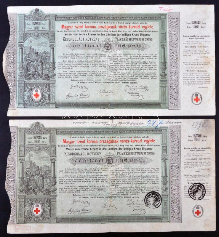 Leírás: Budapest 1882. "Magyar szent korona országainak vörös-kereszt egylete" kisorsolási kötvény 5Ft-ról, egyik bélyegzésekkel (2x) T:III