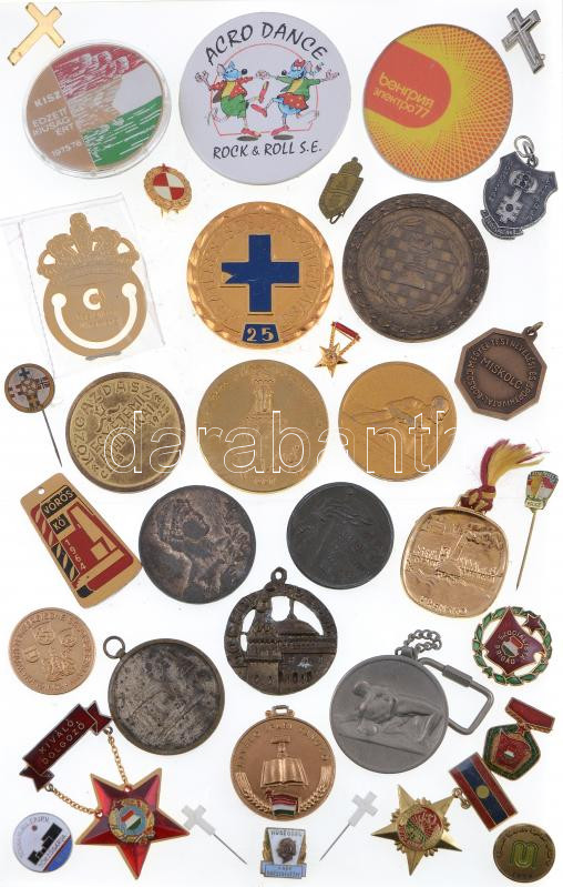 36db vegyes magyar és külföldi, főleg szocialista jelvény, kitüntetés, sportérem, közte "Kiváló Ipari Tanuló" festett Al kitüntetés, "Borsod Megyei Testnevelési és Sporthivatal - Miskolc" Br emlékérem (31mm) T:vegyes