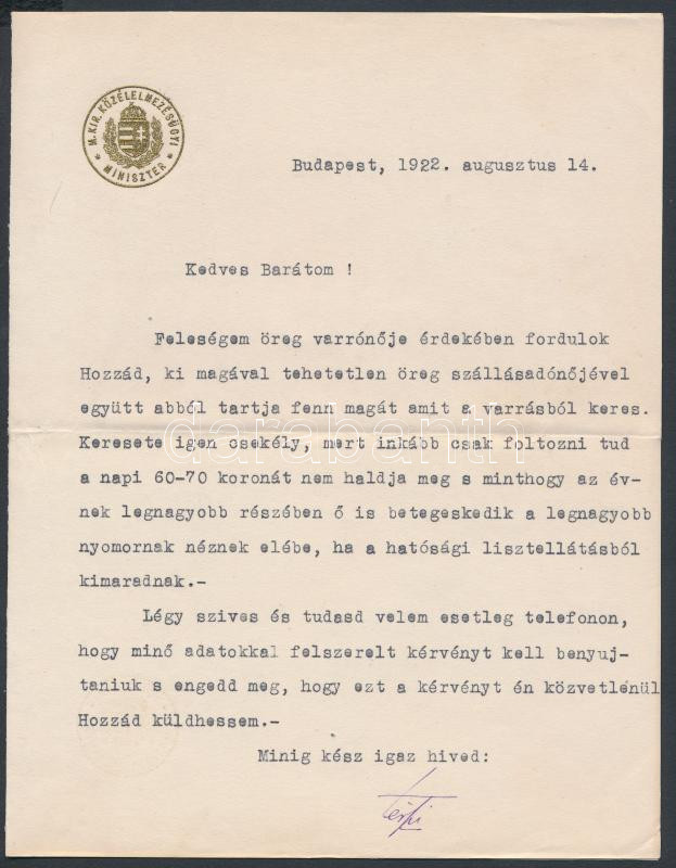 Leírás: 1922 Térfi Béla (1869-1959) közélelmezésügyi miniszter hivatalos levél saját kezű aláírásával