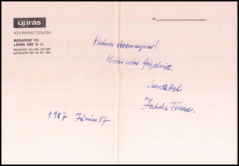 1987 Juhász Ferenc költő aláírása fejléces levélpapíron https://www.darabanth.com/hu/26-Nagyaukcio/26.1/Festmeny-mutargy-papirregiseg-egyeb/Alairas~10266/1987-Juhasz-Ferenc-kolto-alairasa-fejleces-levelpapiron~II1462912