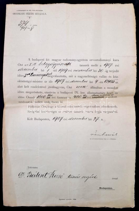 Leírás: Lenhossék Mihály (1863-1937) magyar anatómus, egyetemi tanár, dékán aláírása tanársegédi kinevezésen