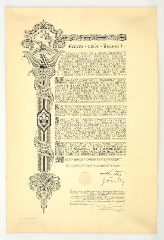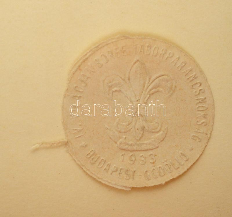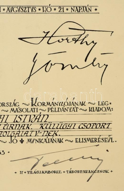 1933 Gödöllői Jamboree, oklevél a külügyi csoport tolmácscsoport vezetőjének csendőrszázadosnak a jó munka elismeréséül. Táborparancsnoki pecséttel és a táborparancsnok, Teleki Pál saját kezű aláírásával. Jó állapotban, 47×31 cm