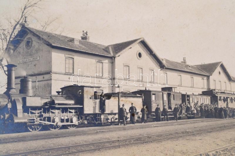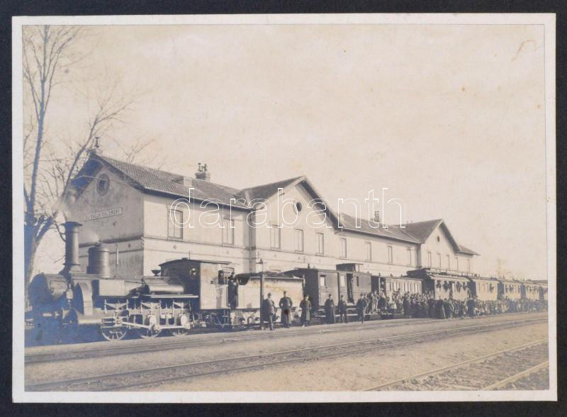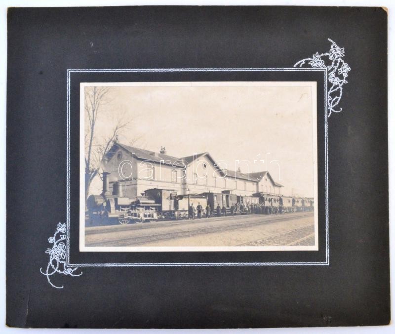 1908 A m. kir. Államvasutak Új Dálja vasútállomása. A MÁV iskola tanulóival megtelt vonat. Fotó méret 22x16 cm, karton méret 36x30 cm Nagyméretű fotó.