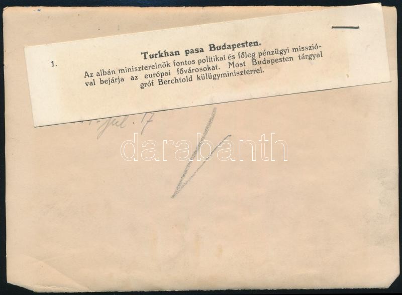 1913 Turkhan pasa albán miniszterelnök. Korabeli sajtófotó, hozzátűzött szöveggel / 1913 Turkhan pasa, prime minister of Albania. Press photo with text attached to it. 18x13 cm