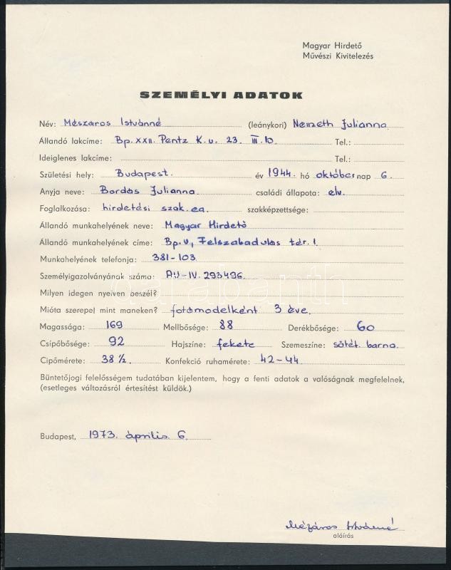 1973 Modell és manöken nyilvántartás egy lapja, 24x18 cm https://www.darabanth.com/hu/26-Nagyaukcio/26.1/Festmeny-mutargy-papirregiseg-egyeb/Foto~10312/1973-Modell-es-manoken-nyilvantartas-egy-lapja-24x18-cm~II1484501