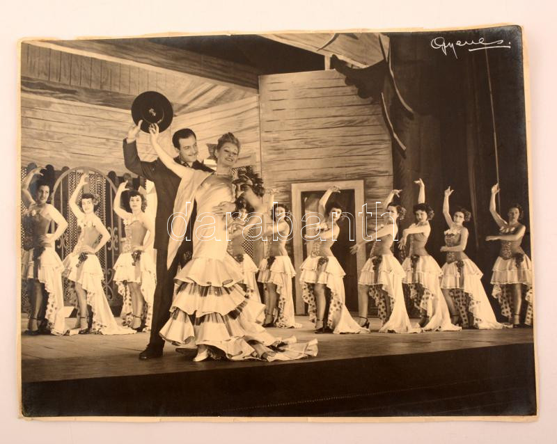 Juan Gyenes, Gyenes János (1912-1995) fotóművész nagyméretű, aláírt képe Muráti Lili (1912-2003) színművésznőről. Spanyolország, színpadi táncjelenet. Kartonlapra ragasztva / Juan Gyenes (1912-1995): Photo of Lili Murati Hungarian/Spanish actress on stage. Signed by Gyenes. 40x30 cm