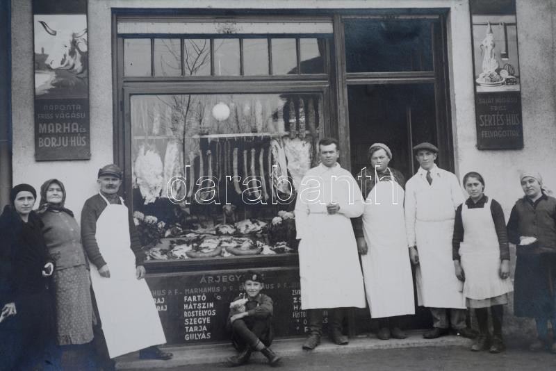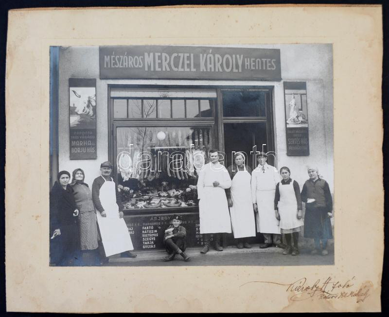 Leírás: cca 1920-1940 Merczel Károly hentesüzlete, Rákosszentmihály, Károly H. fotó, kartonra ragasztva, 18x23 cm.